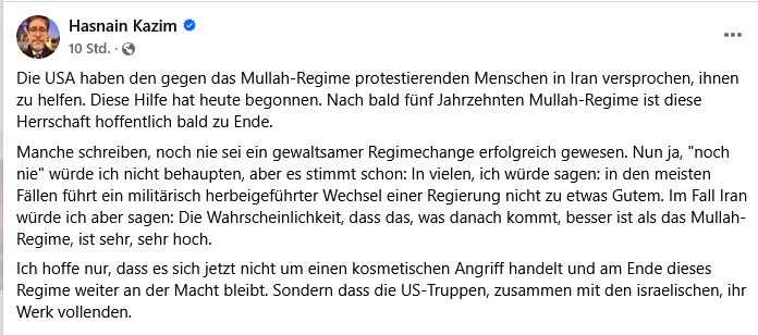 Der ehemalige FDP-Mann hofft also, dass die USA und Israel – dessen Armee als die „humanste“ der Welt gilt – die Menschen im Iran vor dem Mullah-Regime befreien werden. Die lang versprochene Hilfe sei da.