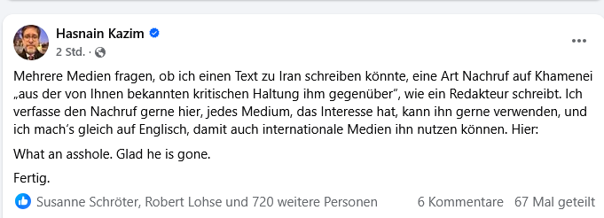 In einem Posting auf Facebook bietet er folgenden Nachruf auf den getöteten Revolutionsführers Ayatollah Khamenei an:
